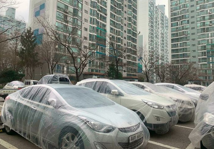 Karena ada renovasi di apartemen, mobil-mobil di parkiran dibungkus plastik agar tidak terkena debu ataupun kotoran. Foto: Bored Panda