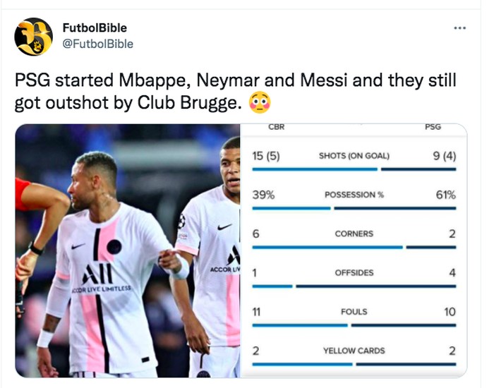 Bahkan Club Brugge menyerang lebih baik dari PSG.Foto: Twitter