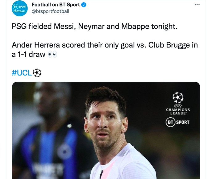 Namun Messi, Neymar dan Mbappe melempem. Skor 1-1 lawan Club Brugge dan gol PSG pun tidak dicetak salah satu dari mereka. Foto: Twitter