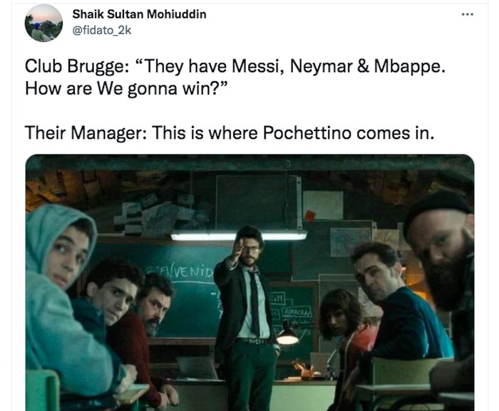 PSG tidak bisa mengalahkan Club Brugge walau lini serangnya mengerikan. Netizen ini menuding pelatih Mauricio Pochettino kurang becus. Foto: Twitter