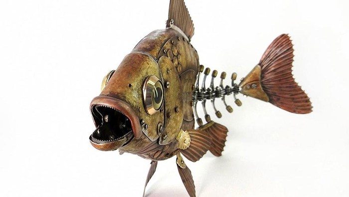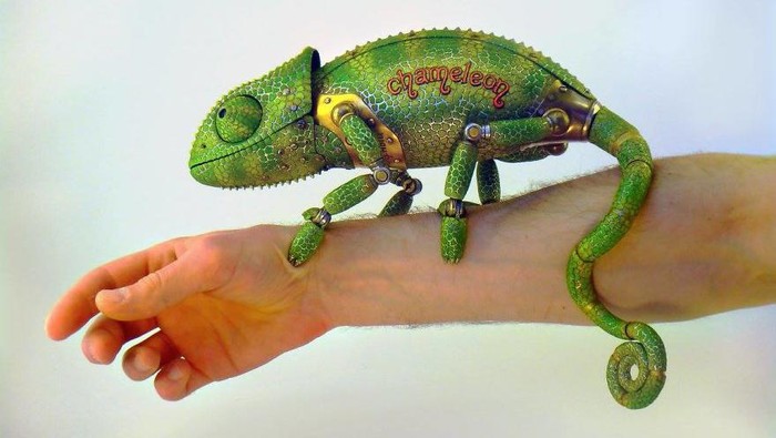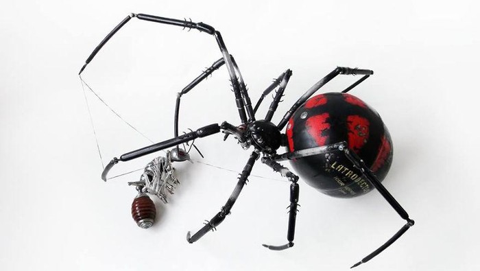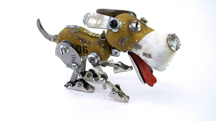 Seorang seniman Rusia bernama Igor Verniy punya cara menarik untuk mendaur ulang limbah elektronik. Ia memanfaatkan bagian-bagian dari barang elektronik maupun mobil tua yang tak lagi terpakai menjadi sebuah hiasan berbentuk hewan. Dok. Detikcom.