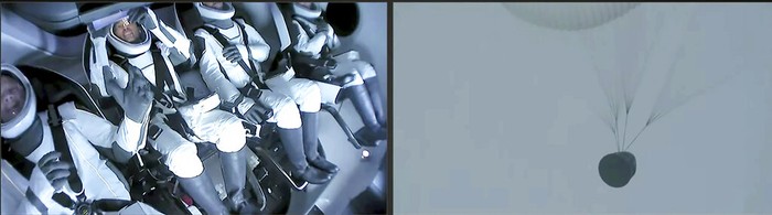 Setelah menjalani misi Inspiration4 selama tiga hari di antariksa, kapsul Crew Dragon kembali ke Bumi. Ini penampakan di dalam kapsul dan saat parasut memperlambat kecepatannya kala mendekati Bumi. Foto: AP