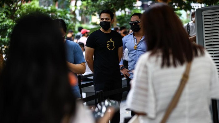 Kendati pandemi, Apple Orchard menyediakan line antrean untuk mereka yang mengambil pesanan pre-order atau membeli langsung iPhone 13. Foto: Feline Lim/Getty Images