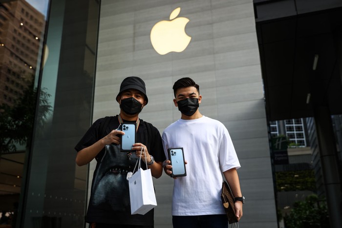 Haikal Putra (kanan) dan Wayne Chang (kiri) membeli iPhone 13 Pro Max. Foto: Feline Lim/Getty Images