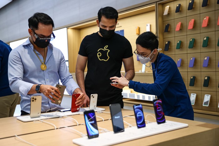 Orang-orang mencoba model iPhone 13 yang baru dirilis di Apple Store di Orchard Road. Foto: Feline Lim/Getty Images