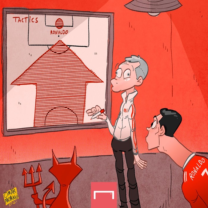 StrategiΒ Ole Gunnar Solskjaer sering dikritik. Dalam karikatur ini dia cuma minta semua pemain kasih bola ke Ronaldo. Foto: (Twitter)