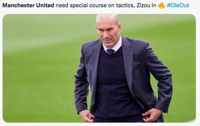 Ada 47.800 tweet dari netizen meneriakan #OleOut. Salah satu meme minta Zidane mengganti Ole Gunnar Solskjaer sebagai pelatih MU. Foto: (Twitter)