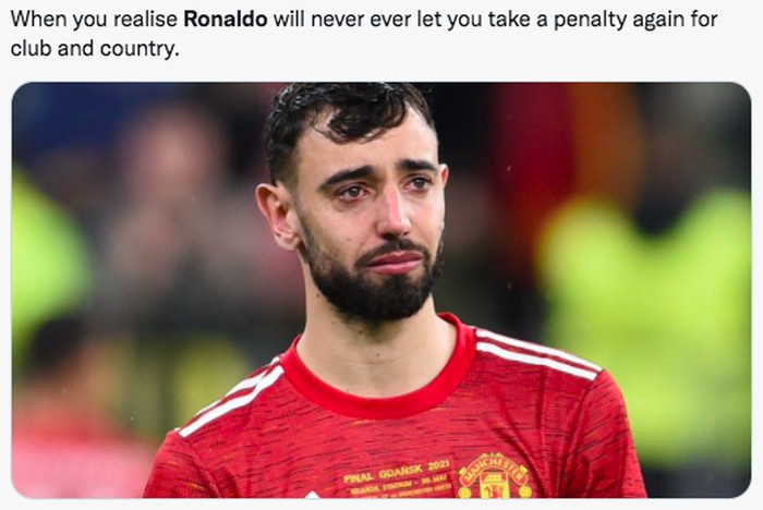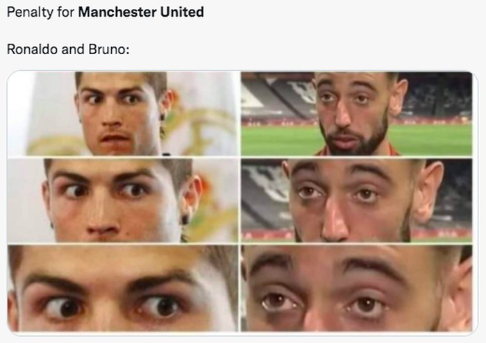 Bruno Fernandes juga jadi target serangan meme. Bruno yang maju sebagai eksekutor penalti sepakannya melambung. MU pun kalah. Dalam meme ini dia bersumpah disuruh Ole. Foto: (Twitter)