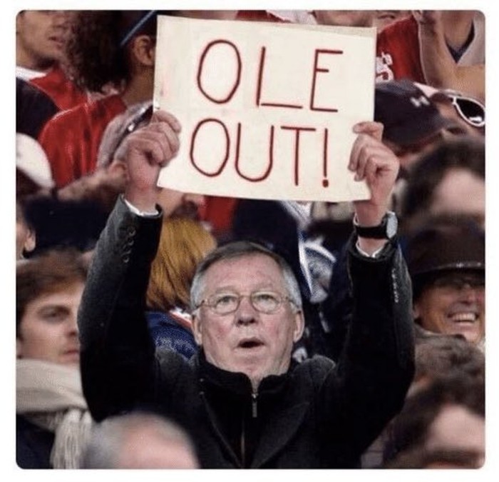 Manchester United tumbang 0-1 dari Aston Villa di kandang. Tagar dan meme #OleOut jadi puncak trending topic Twitter dunia. Misalnya meme editan foto Sir Alex Ferguson. Foto: (Twitter)