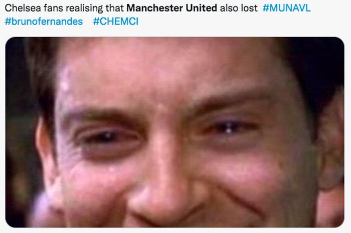 Eh tapi fans Manchester United menangis bahagia. Soalnya Chelsea juga kalah. Meme Spider-Man ini cocok banget. Foto: (Twitter)