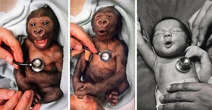 Bayi gorila yang baru lahir dan sedang diperiksa menggunakan stetoskop. Foto: Reddit via Bored Panda