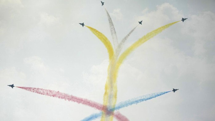 Penampakan sejumlah pesawat yang unjuk kemampuan di langit China saat gelaran Airshow China 2021 berlangsung.