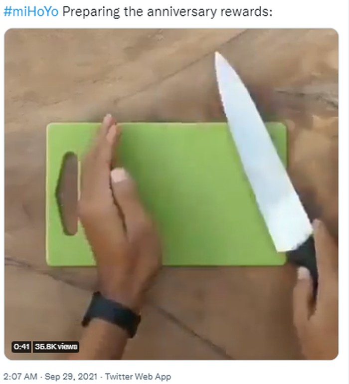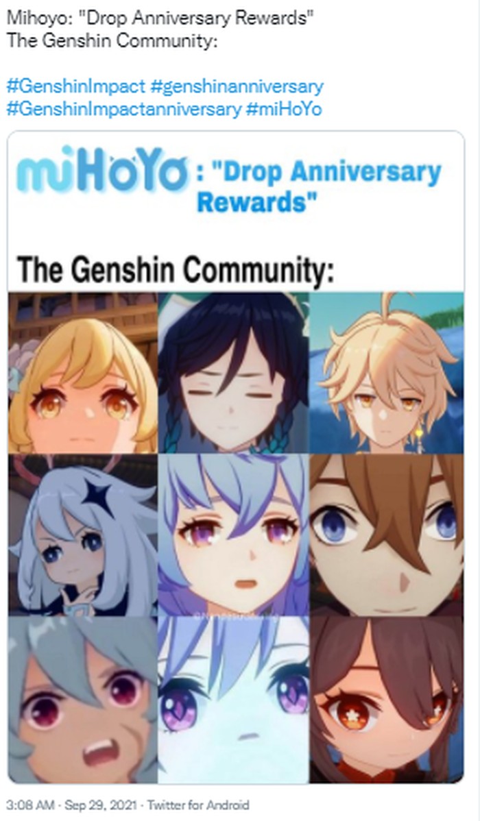Ketika miHoYo menyiapkan hadiah pada perayaan ulan tahunnya. Fans menganggap tidak ada apa-apa. Foto: (Screenshoot Twitter).