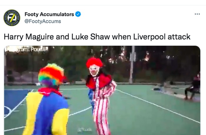 Maguire dan Shaw layaknya badut yang membuat pertahanan MU jadi lelucon. Foto: Twitter
