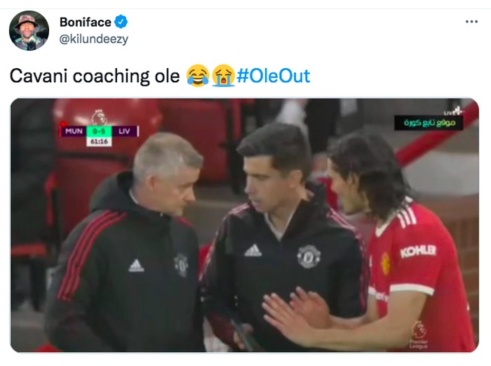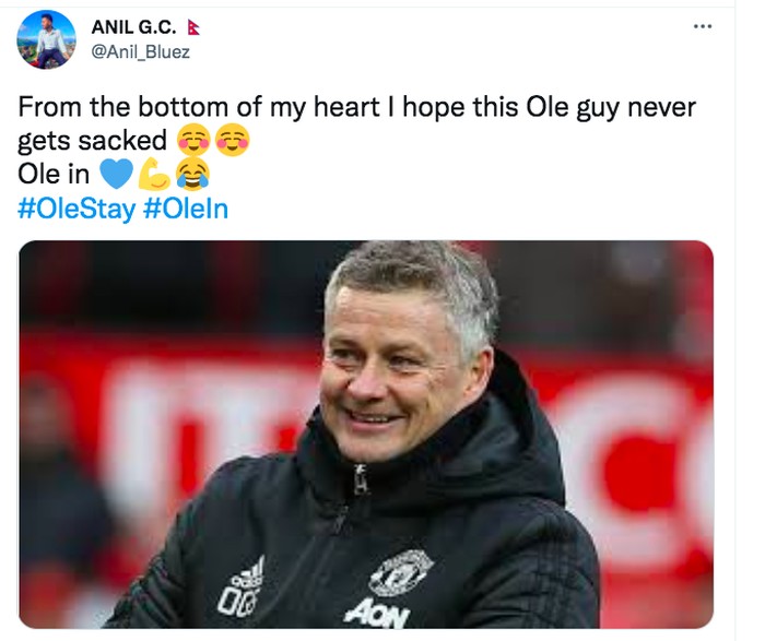 Fans lawan ini meledek agar Ole tidak usah dipecat sampai selama-lamanya. Foto: Twitter