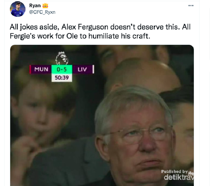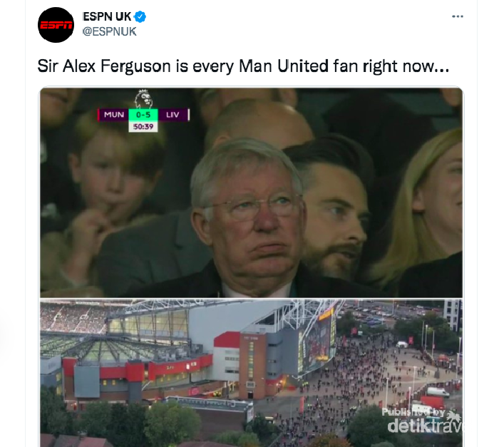 Bahkan Alex Ferguson tidak mempercayai MU dibantai Liverpool. Foto: Twitter