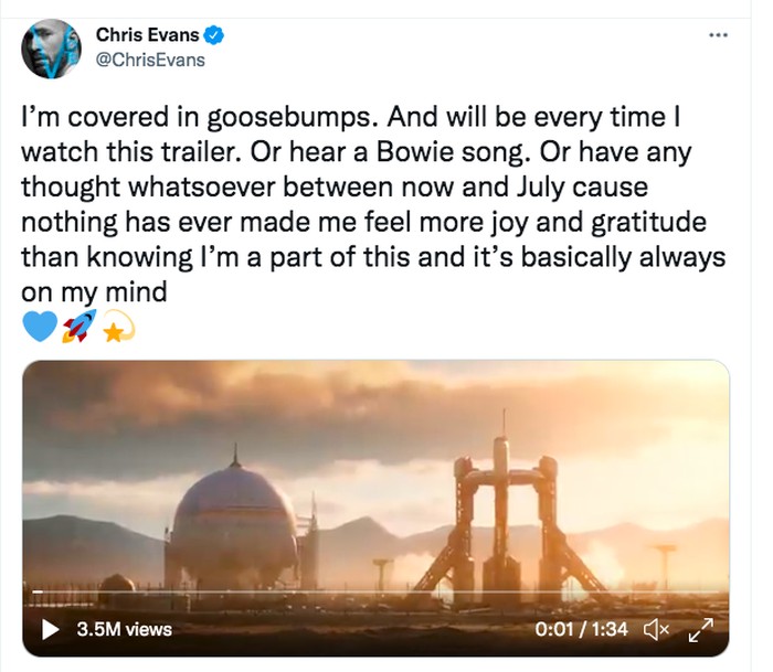 Trailer perdana ini menampilkan Chris Evans sebagai pengisi suara Buzz Lightyear. Sang aktor pun tak sabar menunggu filmnya tayang pada Juli mendatang. Foto: Twitter