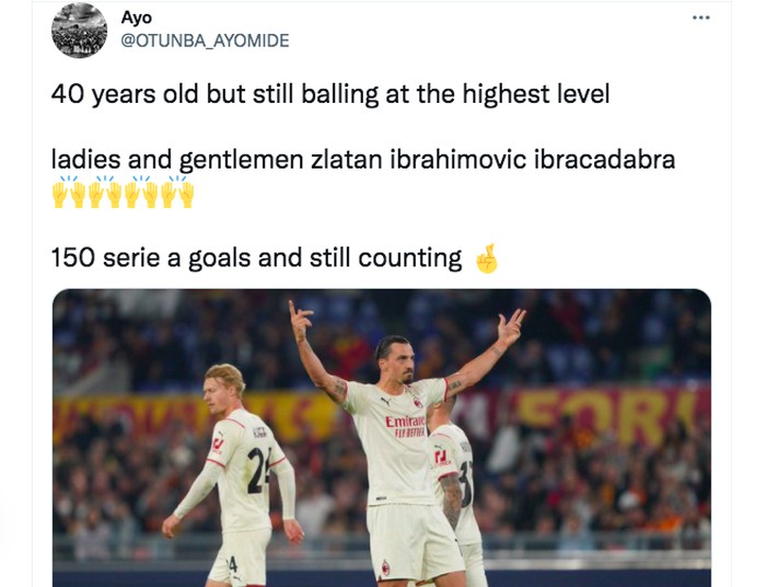 Zlatan mencapai tonggak prestasi luar biasa dengan gol luar biasa di usia 40 tahun. Foto: Twitter