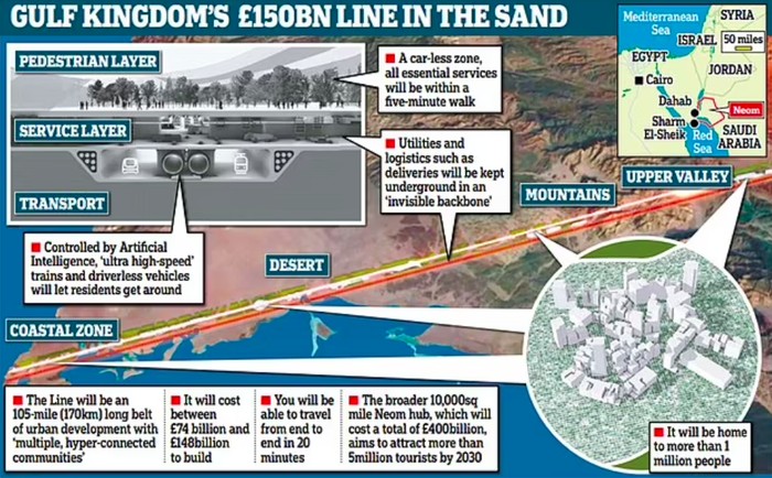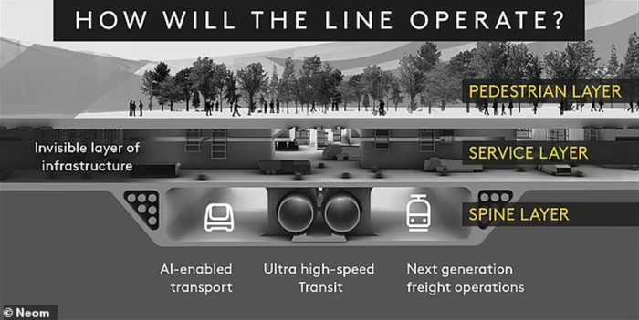 Kota ini akan memiliki tiga lapisan: wilayah permukaan untuk pejalan kaki, dan dua lapisan bawah tanah untuk transportasi dan infrastruktur.Β Foto: Neom