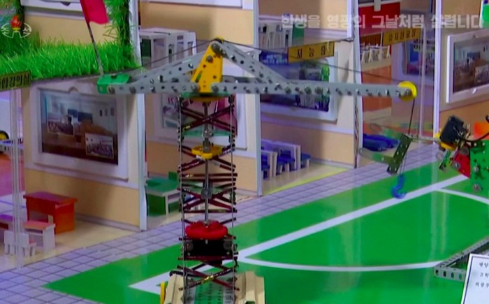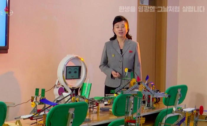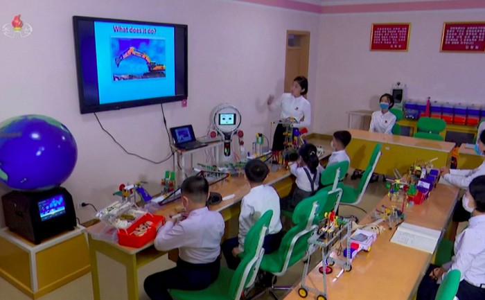 Dalam rekaman yang disiarkan oleh televisi pemerintah Korea Utara KRT, ditampilkan robot bermata biru, berbendera Korea Utara di dadanya, berkeliaran di sekitar ruang kelas di sebuah sekolah di Pyongyang.Β Foto: ReutersΒ