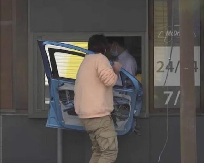 Mau pesan makanan lewat drive thru tapi tidak punya mobil? Cukup bawa pintu mobil saja. Foto: Bored Panda