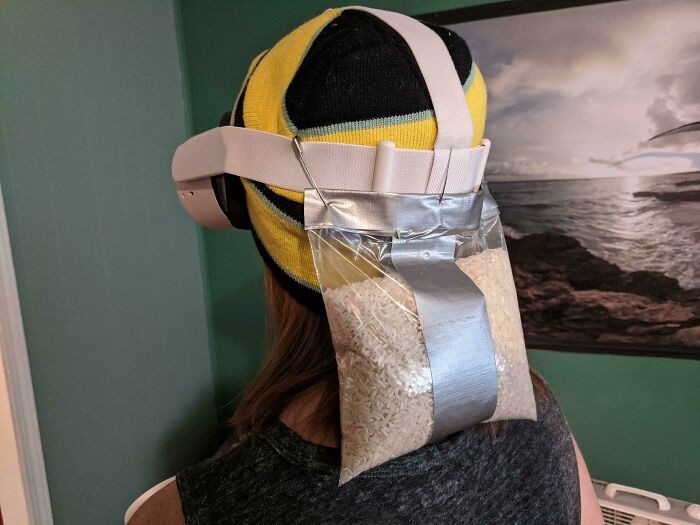 Merasa tidak nyaman pakai kacamata virtual reality? Cukup tempelkan sekantung beras saja. Foto: Bored Panda