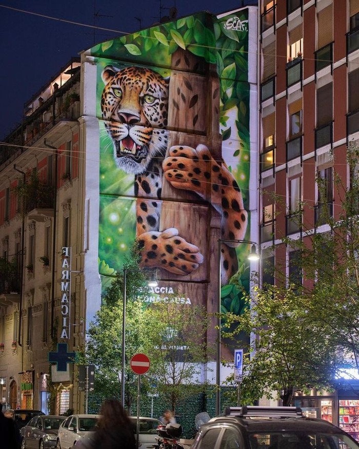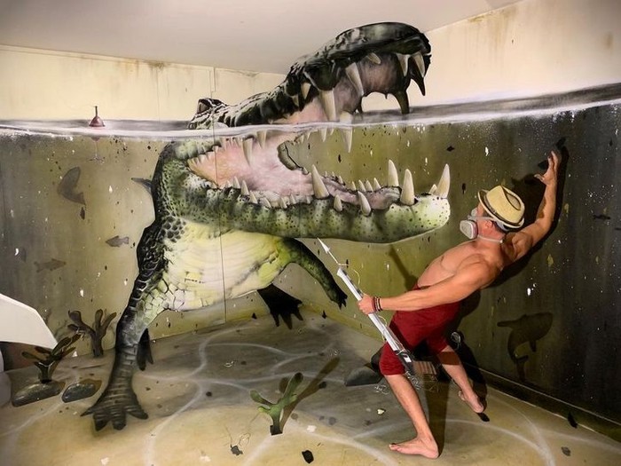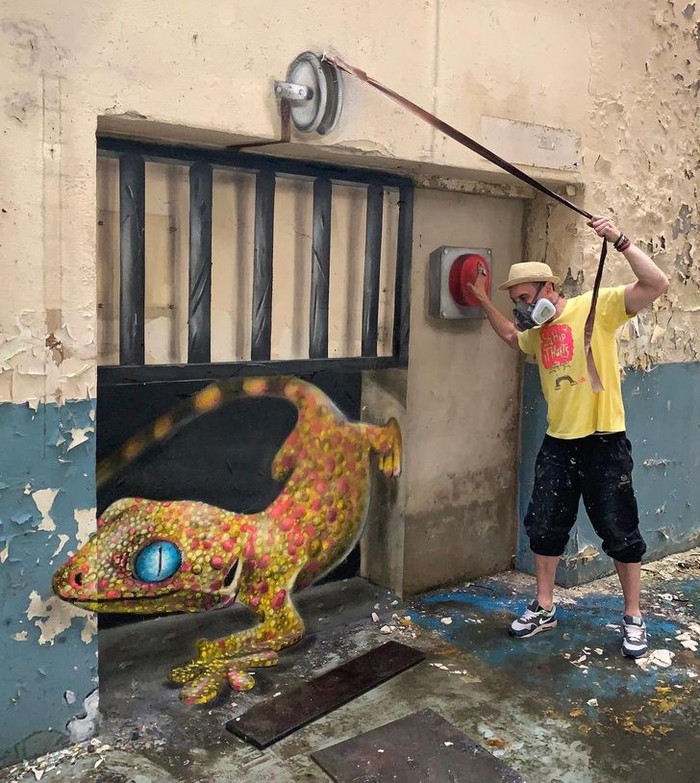 Dengan gambarnya ia mampu menciptakan gambar ilusi optik yang membuat objek gambarnya keluar dari dinding. (Foto: Instagram/scaf_oner)