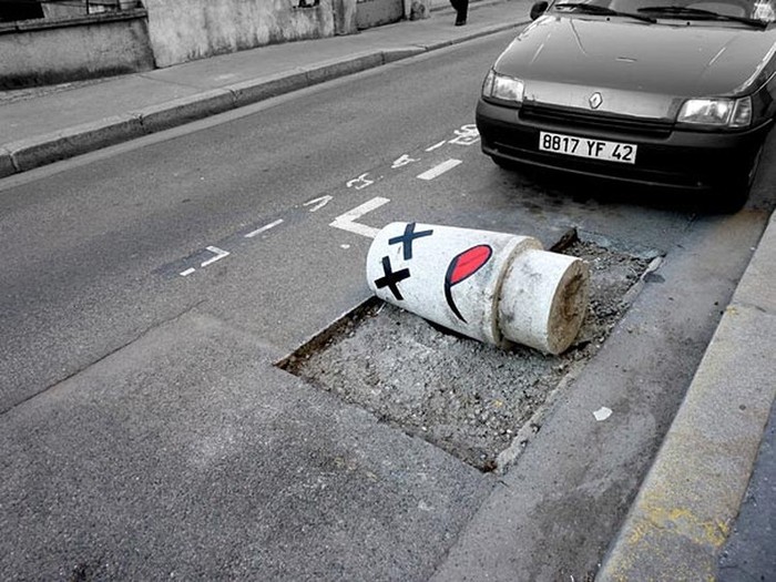 Pembatas jalanan yang rubuh, dibuat seolah seperti korban tabrakan. Foto: imgur