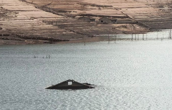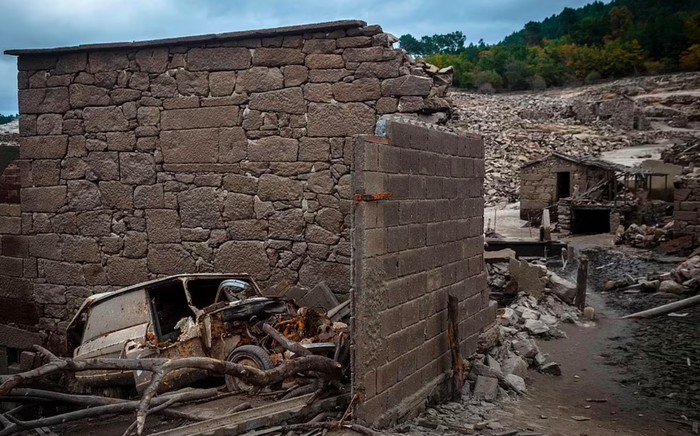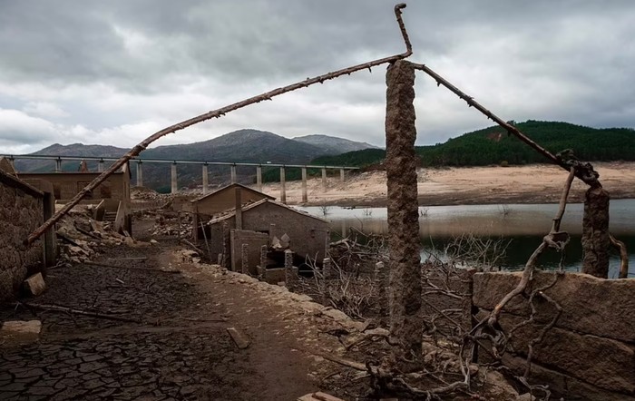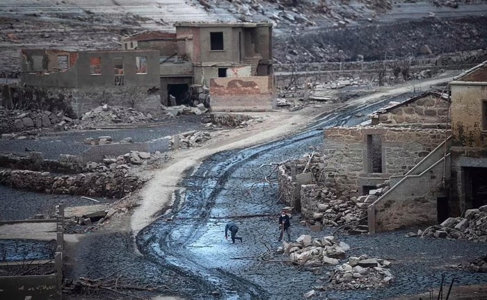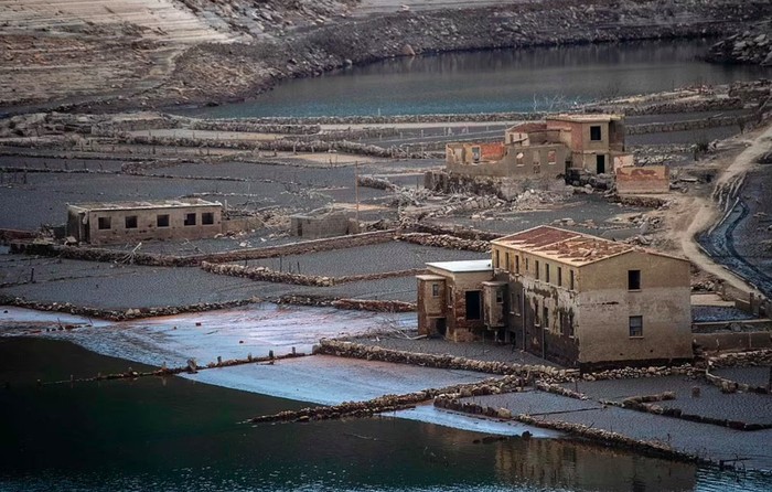Sebuah desa di Spanyol yang ditinggalkan warganya 30 tahun lalu karena proyek pembangunan waduk, tiba-tiba muncul kembali. Reruntuhan rumah penduduk tampak ketika permukaan air turun. Foto: AFP via Daily Mail