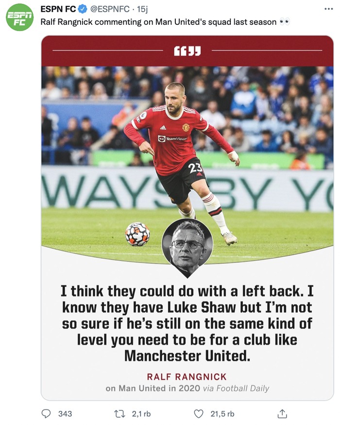 Sebelumnya, Rangnick juga pernah menyoroti performa Luke Shaw. Foto: Internet