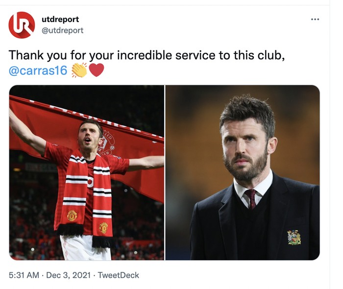 Terima kasih untuk dedikasimu yang luar biasa pada klub ini, Carrick. Foto: Twitter