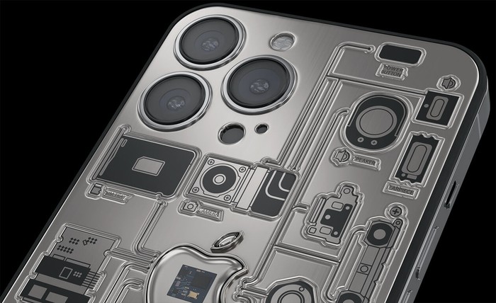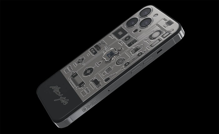 Seluruh bagian belakang ponsel dihiasi dengan ukiran yang memperlihatkan detail teknis iPhone 2G, seperti kamera, baterai, speaker, dan lain-lain. Foto: dok. Caviar
