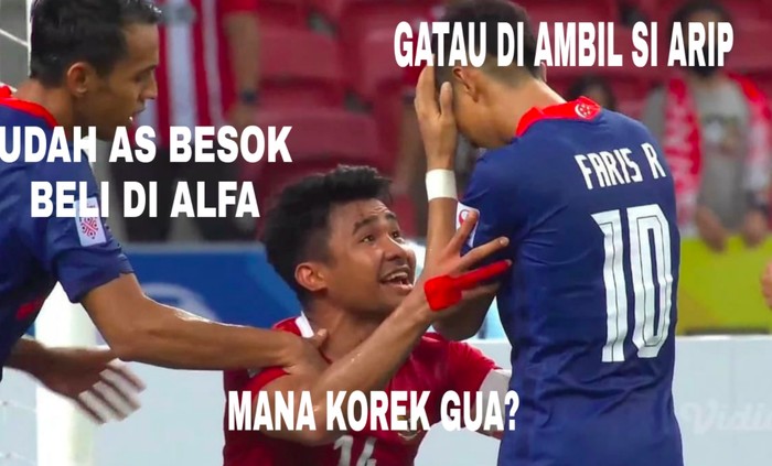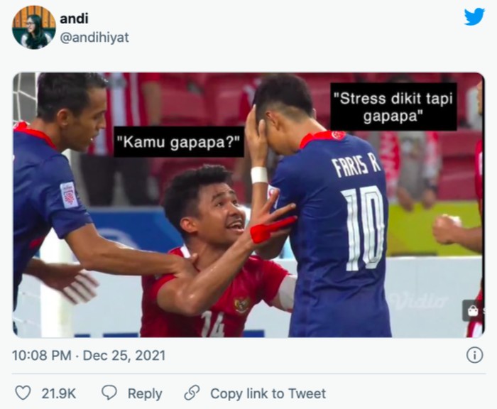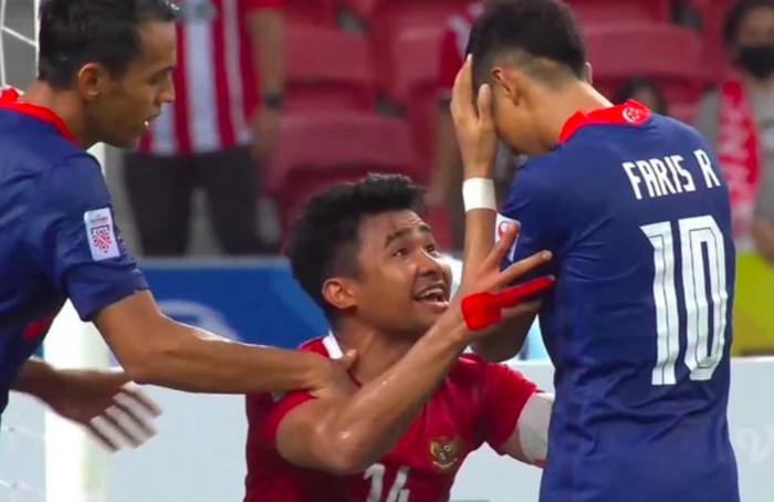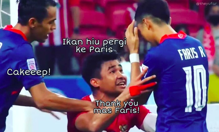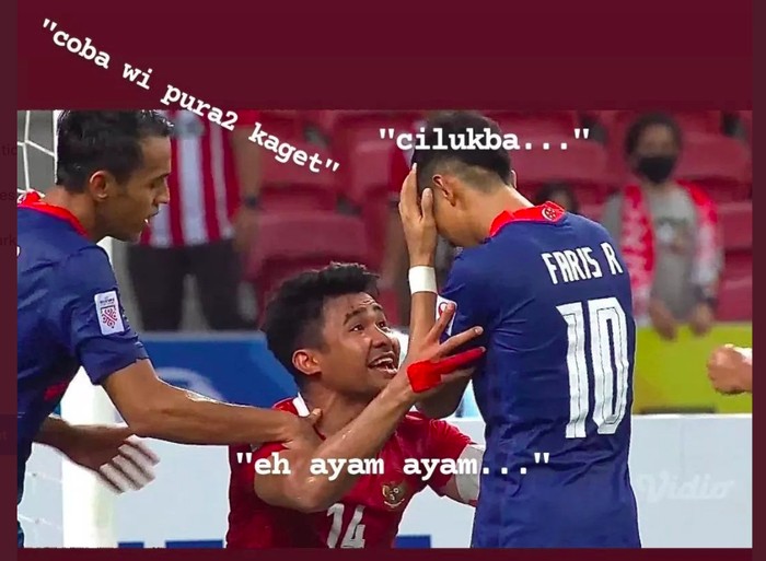 Kegagalan penalti pemain Singapura Faris Ramli yang ditepis Nadeo, bisa dibilang sebagai salah satu momen kunci di laga Indonesia vs Singapura Piala AFF 2020. Usai Faris Ramli gagal penalti, pemain Indonesia Asnawi langsung menghampirinya, dan sepertinya sedikit memprovokasi. Entah apa yang dibilang Asnawi kepadanya, yang jelas momen itu memicu beragam reaksi dan meme kocak dari netizen Indonesia. Foto: Twitter