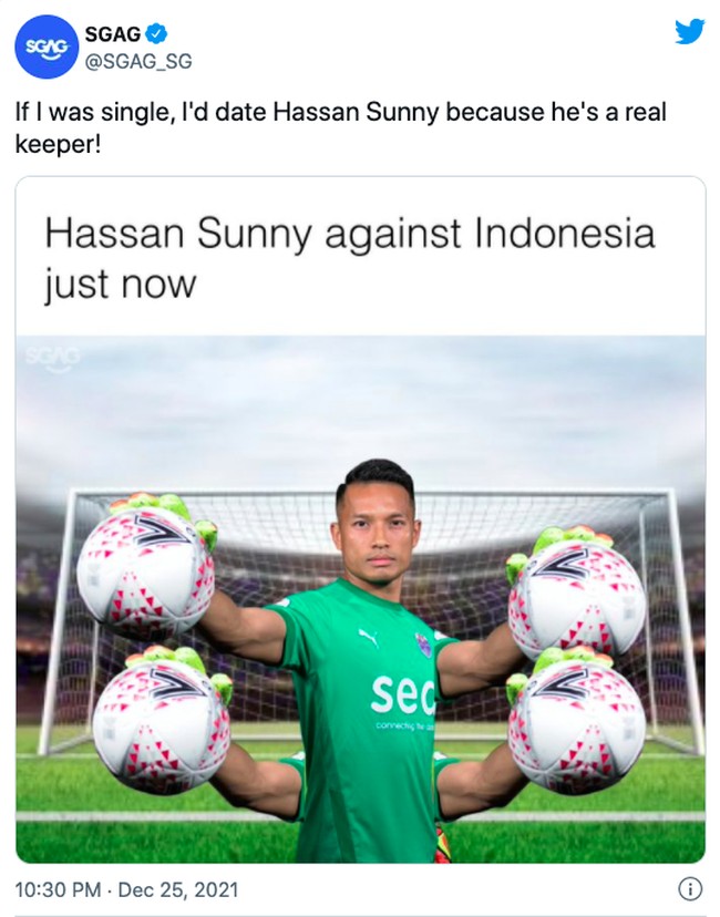 Jakarta - Netizen menilai kiper Singapura Hassan Sunny layak jadi Man of The Match di laga Piala AFF 2020 Indonesia vs Singapura. Berbagai meme tentangnya bertebaran.