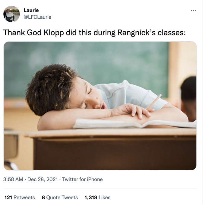 Untung saja pelatih Liverpool Jurgen Klopp ketiduran waktu belajar pada Rangnick sehingga ia malah lebih hebat sebagai pelatih. Foto: Twitter