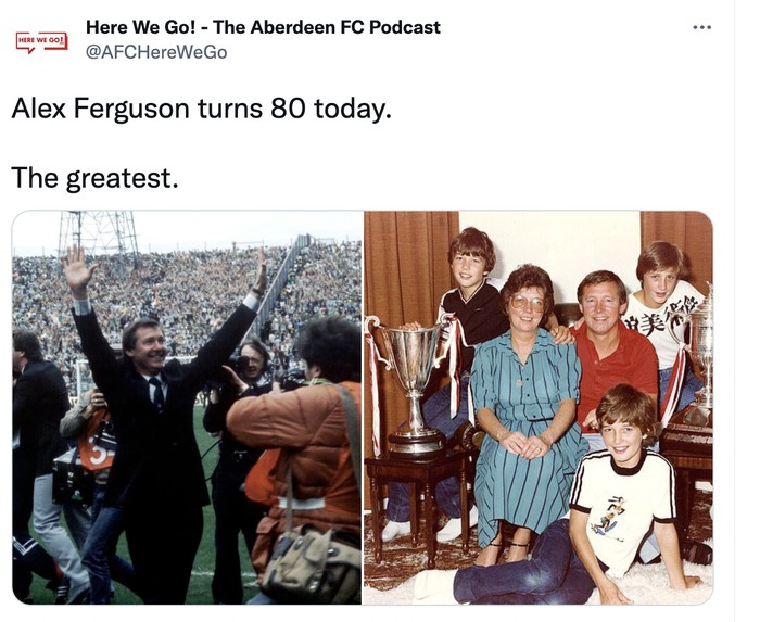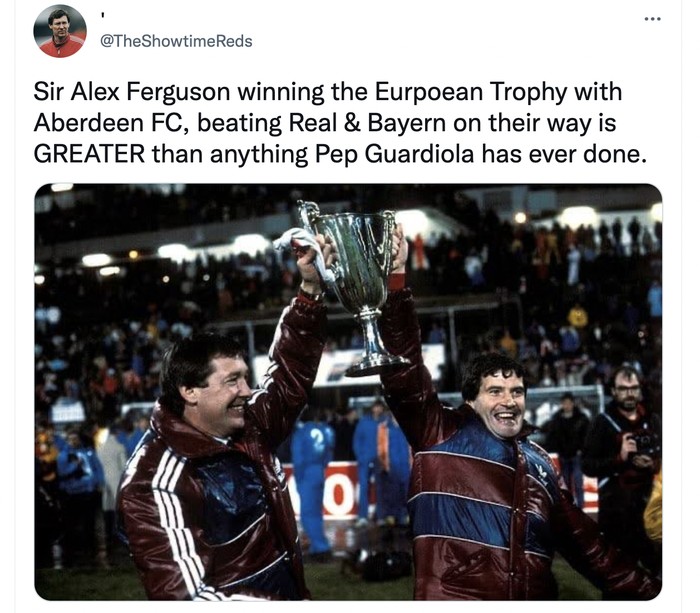 Netizen ini menilai prestasi Sir Alex mengantar tim semenjana Aberdeen memenangkan trofi Eropa dengan mengalahkan Bayern Muenchen dan Real Madrid lebih baik dari apapun yang dicapai Pep Guardiola. Foto: Twitter