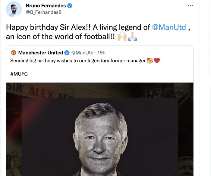 Bruno Fernandes menyebut Sir Alex sebagai legenda hidup dan ikon di dunia sepakbola. Foto: Twitter