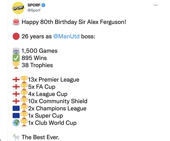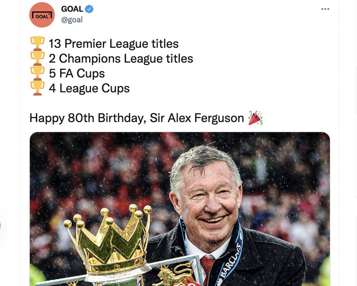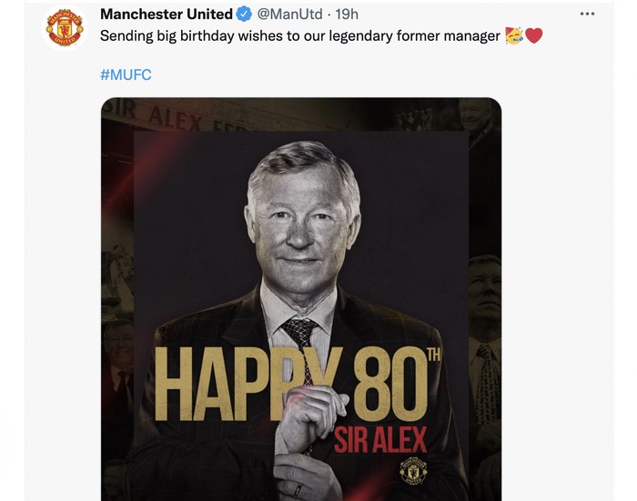 Akun MU di media sosial pun mengucapkan selamat ultah ke-80 bagi manajer terbaik mereka ini. Foto: Twitter
