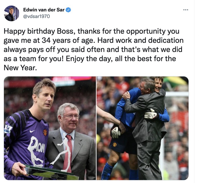 Kiper legendaris MU Edwin Van Der Sar pun memajang foto kala ia diarahkan oleh sang manajer. "Kerja keras dan dedikasi selalu ada hasilnya menurut Anda dan itu yang dulu kita lakukan sebagai tim," sebutnya. Foto: Twitter