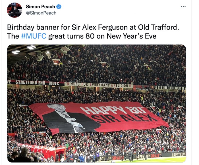 Banner Alex Ferguson dibentangkan di Old Trafford untuk memperingati ultahnya yang ke-80. Foto: Twitter