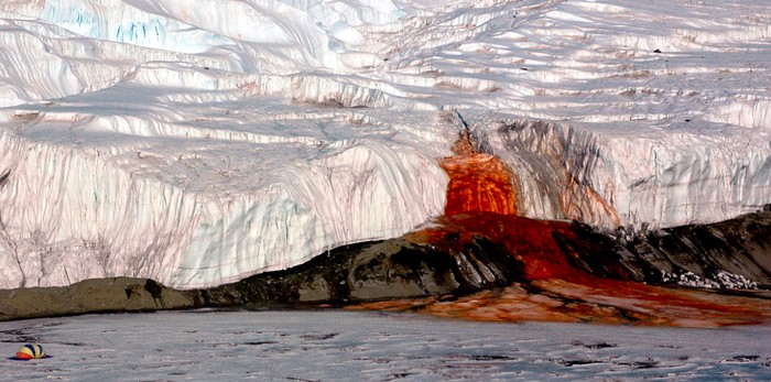 Blood Falls, Antartika. Blood Falls atau Air Terjun Darah adalah aliran air asin yang tercemar oksida besi, mengalir dari lidah Gletser Taylor ke permukaan yang tertutup es di West Lake Bonney di Taylor Valley di McMurdo Dry Valleys di Victoria Land. Air hipersalin yang kaya zat besi secara sporadis muncul dari celah kecil di kaskade es. Foto: Times of India