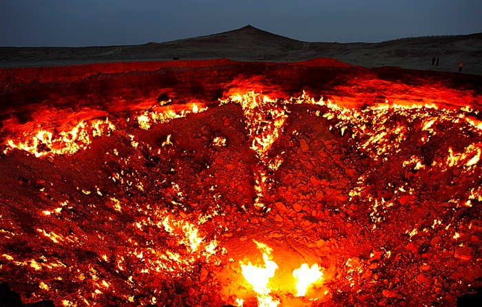 Gerbang Neraka Derweze, Turkmenistan. Di tengah gurun Karakum di Turkmenistan ada sebuah kawah bernama Derweze yang disebut "gerbang neraka". Kawah ini merupakan ladang gas alam yang menyala, sengaja dibakar oleh ahli geologi untuk menghentikan penyebaran gas metana sejak 1971. Foto: Times of India