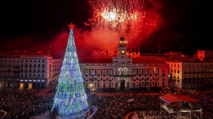 Kembang api menyala saat perayaan Tahun Baru di Madrid Puerta del Sol di pusat kota Madrid, Spanyol, Sabtu dini hari, 1 Januari 2022.Β AP/Manu Fernandez