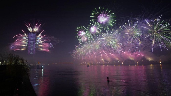 Orang-orang menonton pertunjukan laser selama perayaan Tahun Baru di Bucharest, Rumania, Sabtu, 1 Januari 2022. Ribuan orang berkumpul di tepi danau untuk menghadiri konser dan menonton kembang api dan pertunjukan laser selama perayaan Tahun Baru di ibukota Rumania.Β AP/Andreea Alexandru