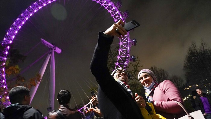 Sepasang kekasih mengambil selfie dengan London Eye sebagai latar belakang saat mereka berkumpul di tepi selatan Sungai Thames untuk merayakan Malam Tahun Baru di London, Jumat, 31 Desember 2021.Β AP/Alberto Pezzali
