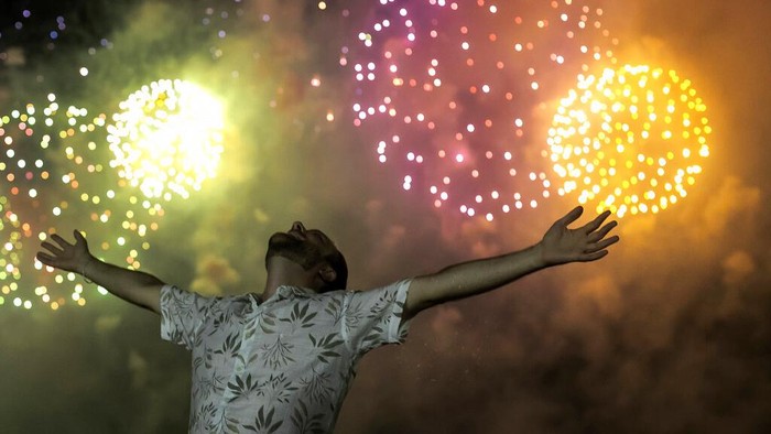 Seorang pria merayakan awal Tahun Baru, dengan latar belakang kembang api yang menyala di latar belakang Pantai Copacabana di Rio de Janeiro, Brasil, Sabtu, 1 Januari 2022.Β AP/Bruna Prado
