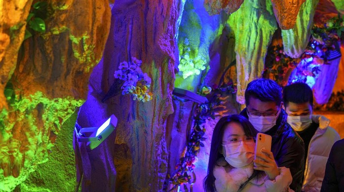 Seorang wanita mengenakan masker wajah untuk membantu mengekang penyebaran virus corona mengambil foto smartphone saat dia dan teman-temannya berjalan melewati batu tiruan yang diterangi di Nanluoguxiang, tempat wisata populer ibu kota selama liburan akhir pekan di Beijing, Minggu, 2 Januari 2022.Β AP/Andy Wong