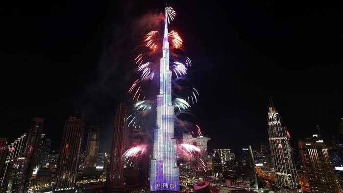 Kembang api di Burj Khalifa, gedung tertinggi di dunia, saat perayaan malam tahun baru di Dubai, Uni Emirat Arab, Sabtu, 1 Januari 2022.Β AP/Kamran Jebreili