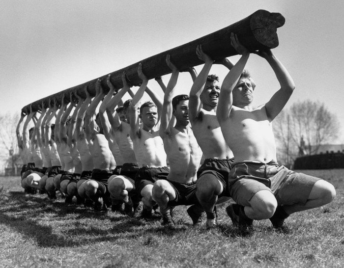 Tentara AS berlatih kekuatan dengan mengangkat tiang telegraf pada masa Perang Dunia II, April 1942. (Photo by George W. Hales/Fox Photos/Getty Images)