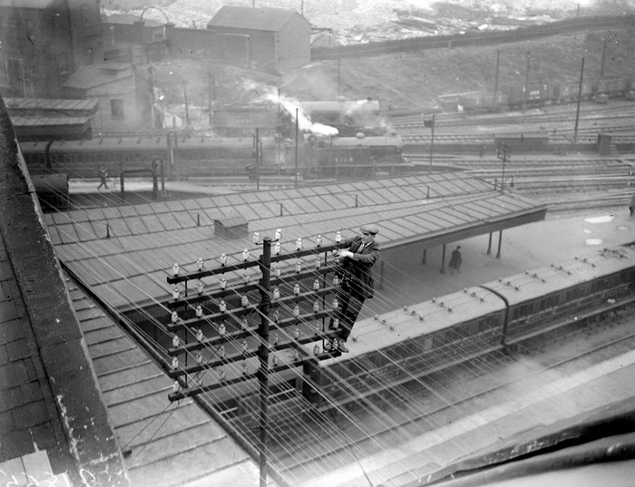 Pekerja melakukan perawatan kabel telegraf di atas peron Stasiun King Cross, London, Oktober 1929. (Foto oleh Fox Photos/Getty Images)